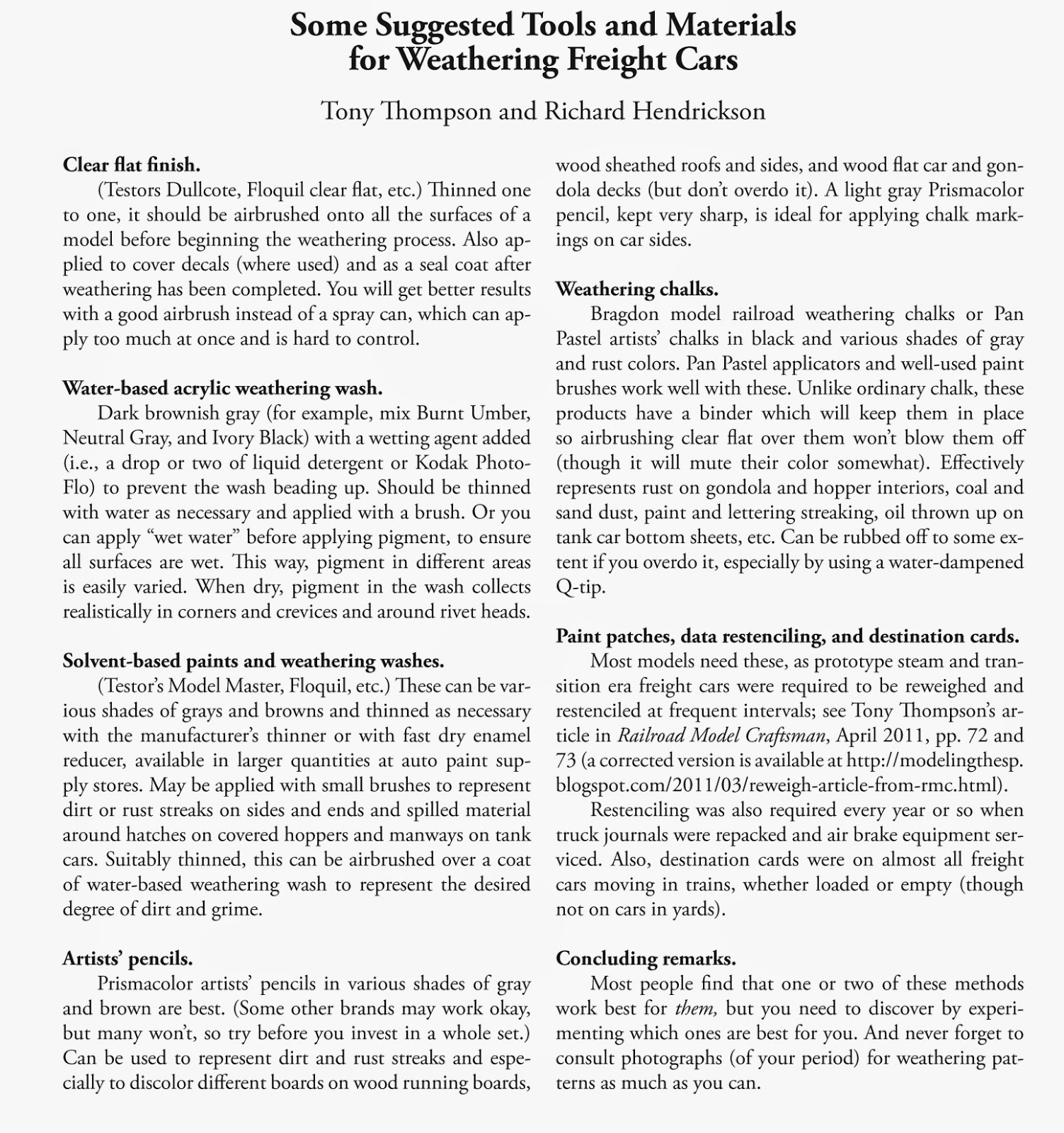 For completeness, it seemed appropriate to include in the first document the handout Richard Hendrickson and I developed when we first presented our joint clinic on weathering. That has been done, and it is also shown below, for those who may not have seen it. You can click on the image to enlarge it.