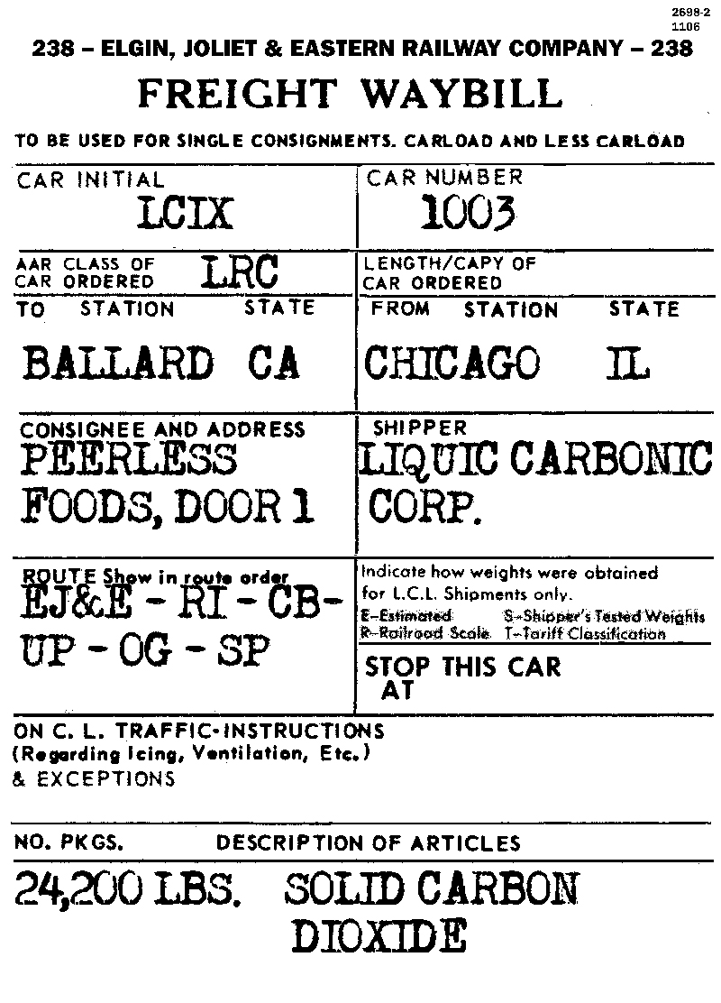 I researched the operations of Liquid Carbonic to find out where they had plants around the country to manufacture dry ice. Their real focus was originally on “carbonic acid,” which is carbon dioxide in water, supplied under pressure to get more CO2 into solution, and used to make carbonated water for soda fountains (for a nice summary of their role here, see this: https://www.drugstoremuseum.com/soda-fountain/liquid-carbonic-co/ ). In fact, Liquid Carbonic manufactured complete soda fountains for years. When they started producing dry ice, they took advantage of their name recognition, and called it “carbonic ice,” as is lettered on this car. Later they got into the supply of many industrial gasses. Their main plant was in Chicago, so I decided to have my on-line shipments arrive from there. Here is one of the waybills I use.